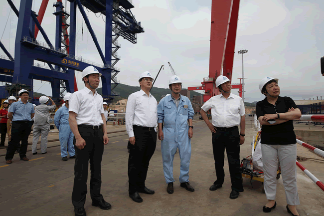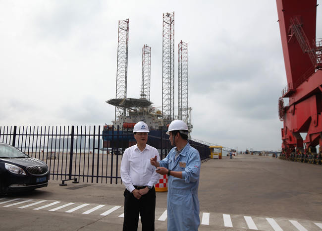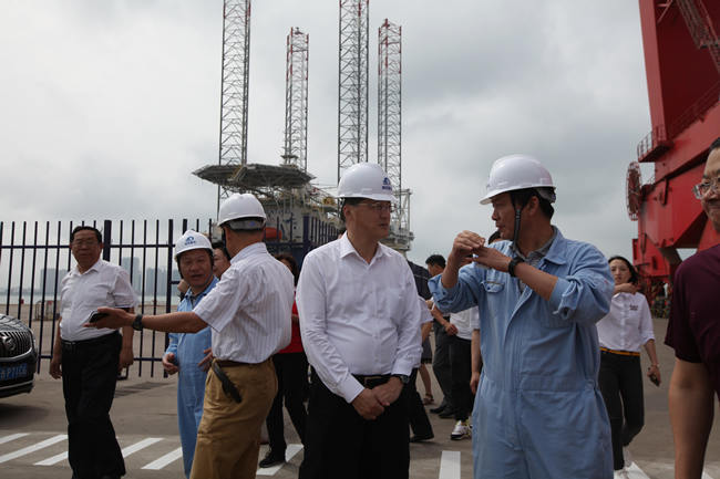 楊軍一行參觀了海西重機港口設(shè)備總裝現(xiàn)場,并重點參觀了在建的阿聯(lián)酋110米桁架自升式海工平臺,聽取了海西重機董事長鄧振山對公司目前生產(chǎn)經(jīng)營形勢、生產(chǎn)負(fù)荷情況等方面的介紹,對海西重機在國際海工平臺市場上所取得的成績給予了肯定。