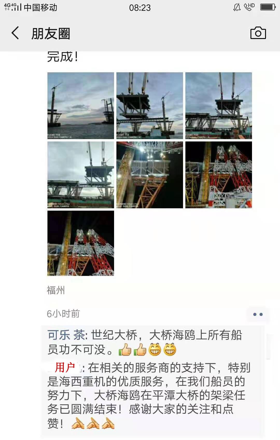 7月28日接到用戶通知,“大橋海鷗號(hào)”將于7月28日晚進(jìn)行第64、65片8鋼梁的架設(shè)(單重達(dá)3200噸),為保證工程順利實(shí)施,請(qǐng)海西重機(jī)安排技術(shù)人員進(jìn)行保駕護(hù)航,用船長(zhǎng)的話就是“你們?cè)诂F(xiàn)場(chǎng),感到心里踏實(shí)”。公司當(dāng)即安排附近正在羅源灣碼頭做電控系統(tǒng)改造的宋靖浩工程師,前往現(xiàn)場(chǎng)。7月2900日傍晚5點(diǎn),吊裝正式開始,各崗位人員各負(fù)其責(zé),密切配合。直到凌晨時(shí)分,2片鋼梁順利架設(shè)完成,設(shè)備運(yùn)行一切正常,用戶對(duì)海西重機(jī)設(shè)備的穩(wěn)定性和服務(wù)的及時(shí)性給予了高度評(píng)價(jià)。至8月6日,平潭海峽公鐵大橋,最后一片鋼梁順利架設(shè)完成, “大橋海鷗號(hào)”不辱使命,圓滿完成任務(wù)。用戶喜悅的表?yè)P(yáng),就是對(duì)我們優(yōu)質(zhì)服務(wù)的認(rèn)可和正反饋。