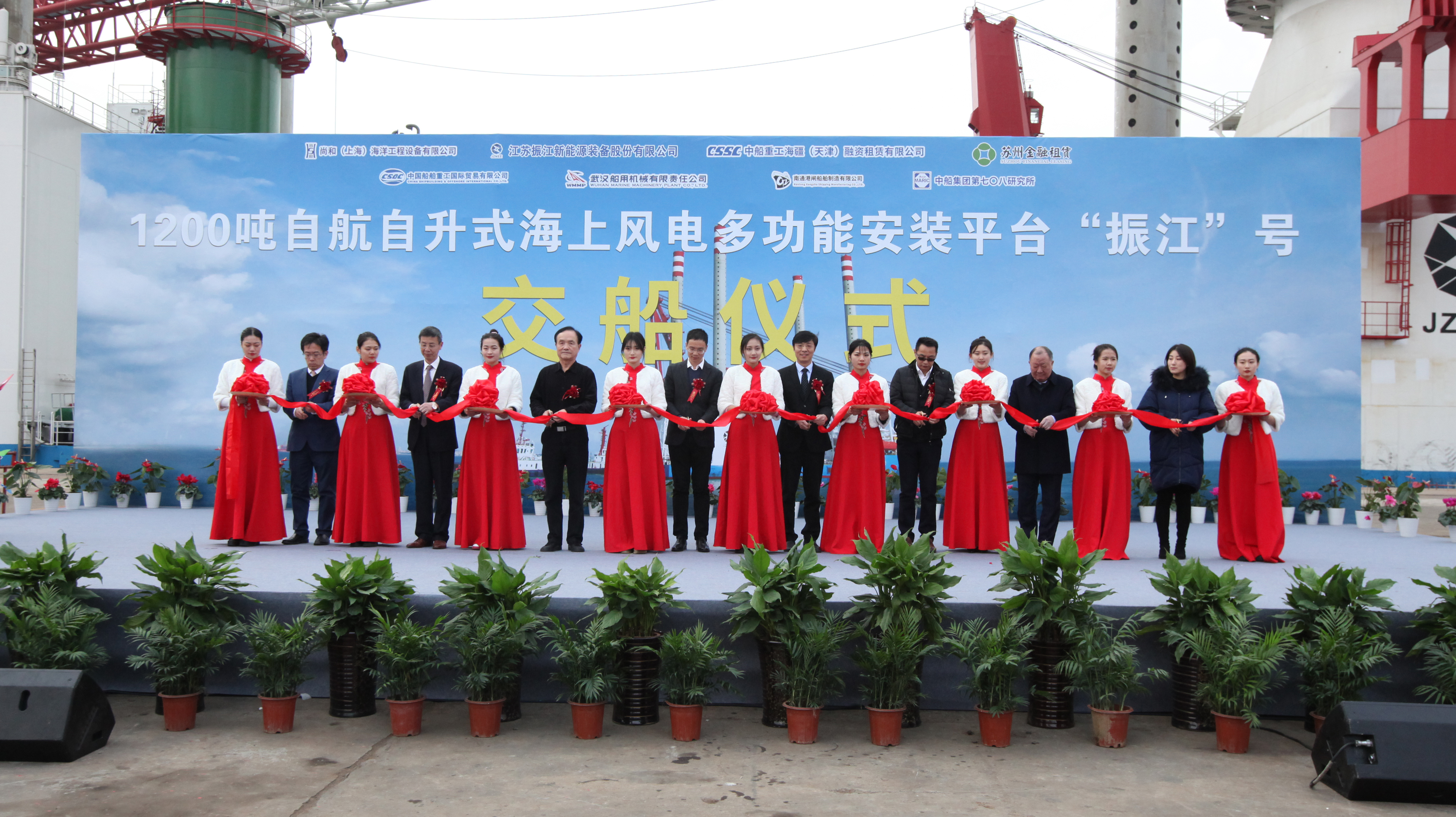 12月13日下午,國內(nèi)首座1200噸自航自升式風(fēng)電安裝平臺——“振江”號交付儀式在武漢船機(jī)海西重機(jī)隆重舉行。尚和(上海)海洋工程裝備有限公司、江蘇振江新能源裝備股份有限公司、中信銀行、中國船舶及海洋工程設(shè)計研究院、中國船級社等單位領(lǐng)導(dǎo)和項目相關(guān)人員共同見證了這一歷史性時刻。