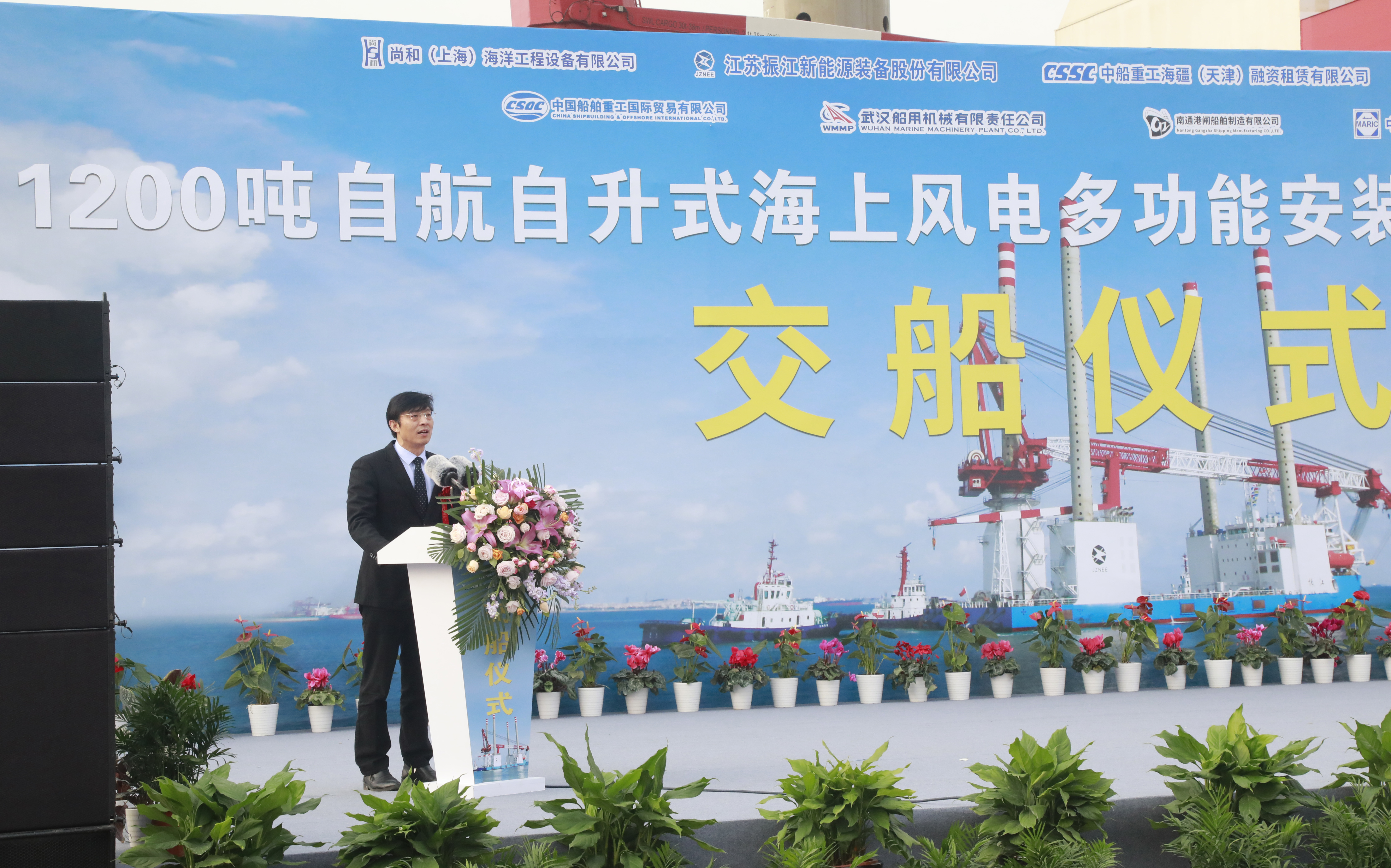 武漢船機(jī)黨委書記、董事長馬聚勇代表公司在平臺交付儀式上致辭,對參加交船儀式的各位領(lǐng)導(dǎo)、同仁以及為該平臺生產(chǎn)制造和試驗成功付出辛勤勞動的所有監(jiān)造人員和工作人員表示由衷感謝。馬聚勇同志指出,“振江”號風(fēng)電安裝平臺是武漢船機(jī)連續(xù)交付多艘自升式輔助平臺后,再次作為總包方承擔(dān)的全部項目建造任務(wù)。項目合同簽訂后,公司上下高度重視,充分發(fā)揮設(shè)備集成和平臺總包能力,集中武漢本部和青島海西兩地優(yōu)勢資源,不斷加強生產(chǎn)組織管理,從源頭上保證了建造質(zhì)量和周期,較好地滿足了平臺建造進(jìn)展。自平臺開工建造到今天正式交船,中國船級社始終給予悉心指導(dǎo),各參建方發(fā)揮自身優(yōu)勢,通力合作,突破多項技術(shù)難關(guān),為平臺順利交付和使用提供了強有力保障