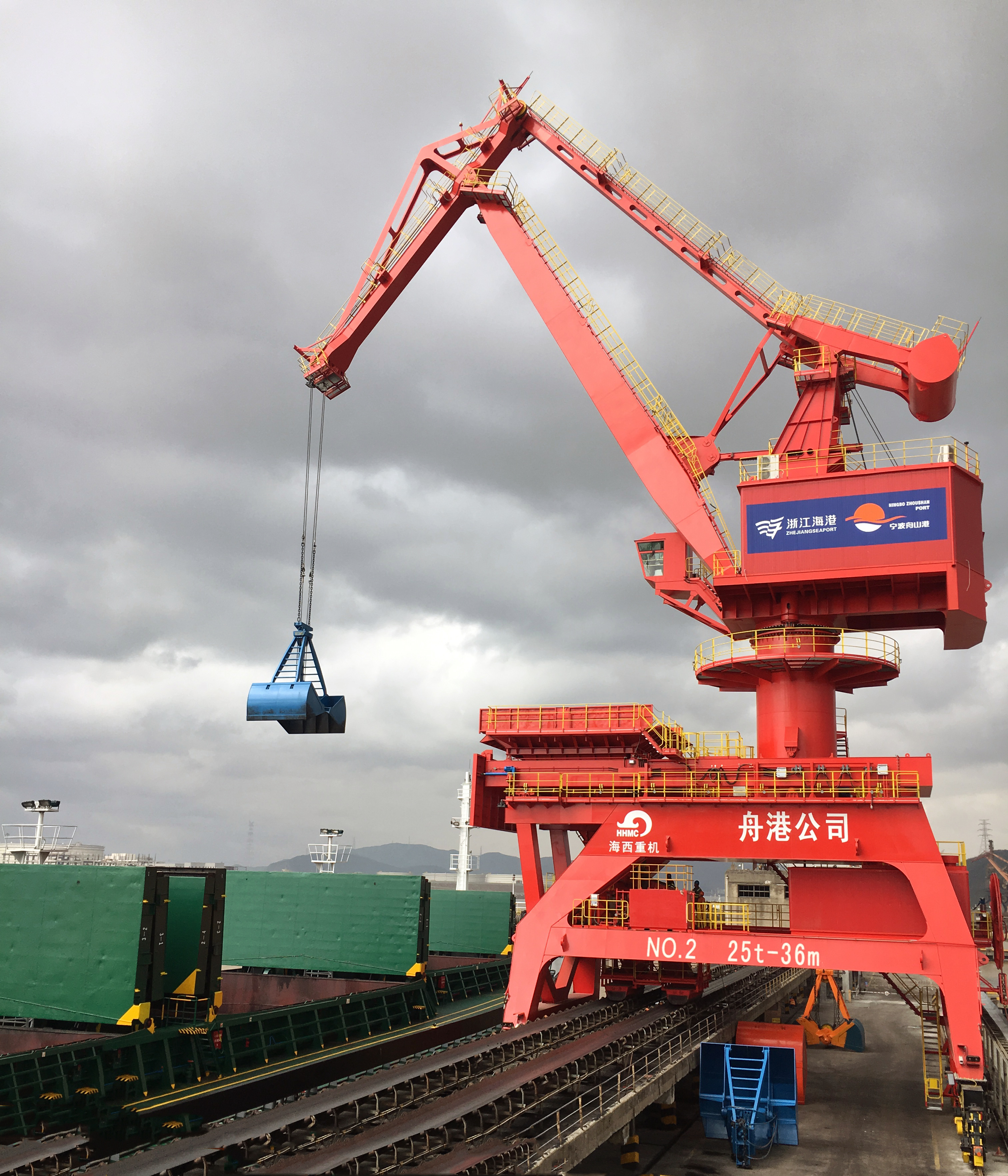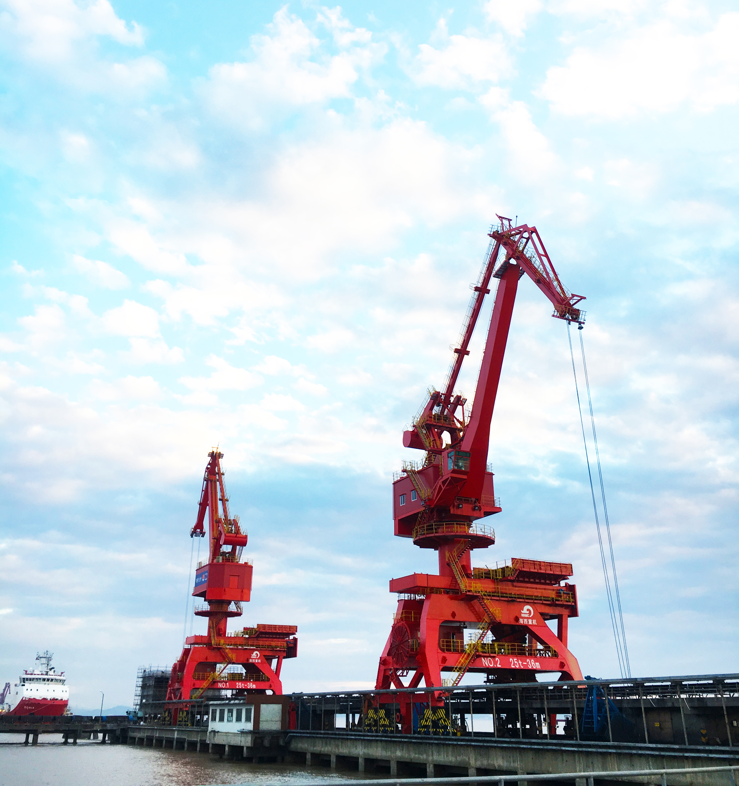 這2臺門機為25T-36M四連桿帶斗門座式起重機,額定起重量可達25噸,工作幅度36米,額定工作效率800噸/時,是海西重機成熟的門機產(chǎn)品,也是目前各大港口廣泛使用的典型門機之一,設(shè)備主要用于煤炭和海沙的卸船。