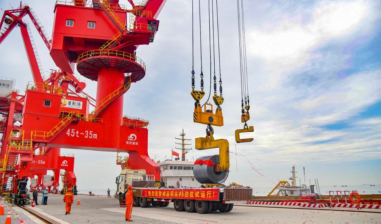 3臺門機應(yīng)用于用戶剛剛投產(chǎn)的6#泊位——日照鋼鐵精品基地配套成品碼頭工程泊位,泊位為4萬噸級雜貨泊位,長度265米,年設(shè)計通過能力120萬噸。作為日照港山鋼碼頭有限公司成立以來建成的第一個泊位,將與山鋼集團日照公司實現(xiàn)“前港后廠”一體化運營,滿足成品及部分原料海路運輸?shù)钠惹行枨?,為鋼鐵精品基地開辟最便捷、最經(jīng)濟的通道,推動“鋼港”發(fā)展邁上新臺階。