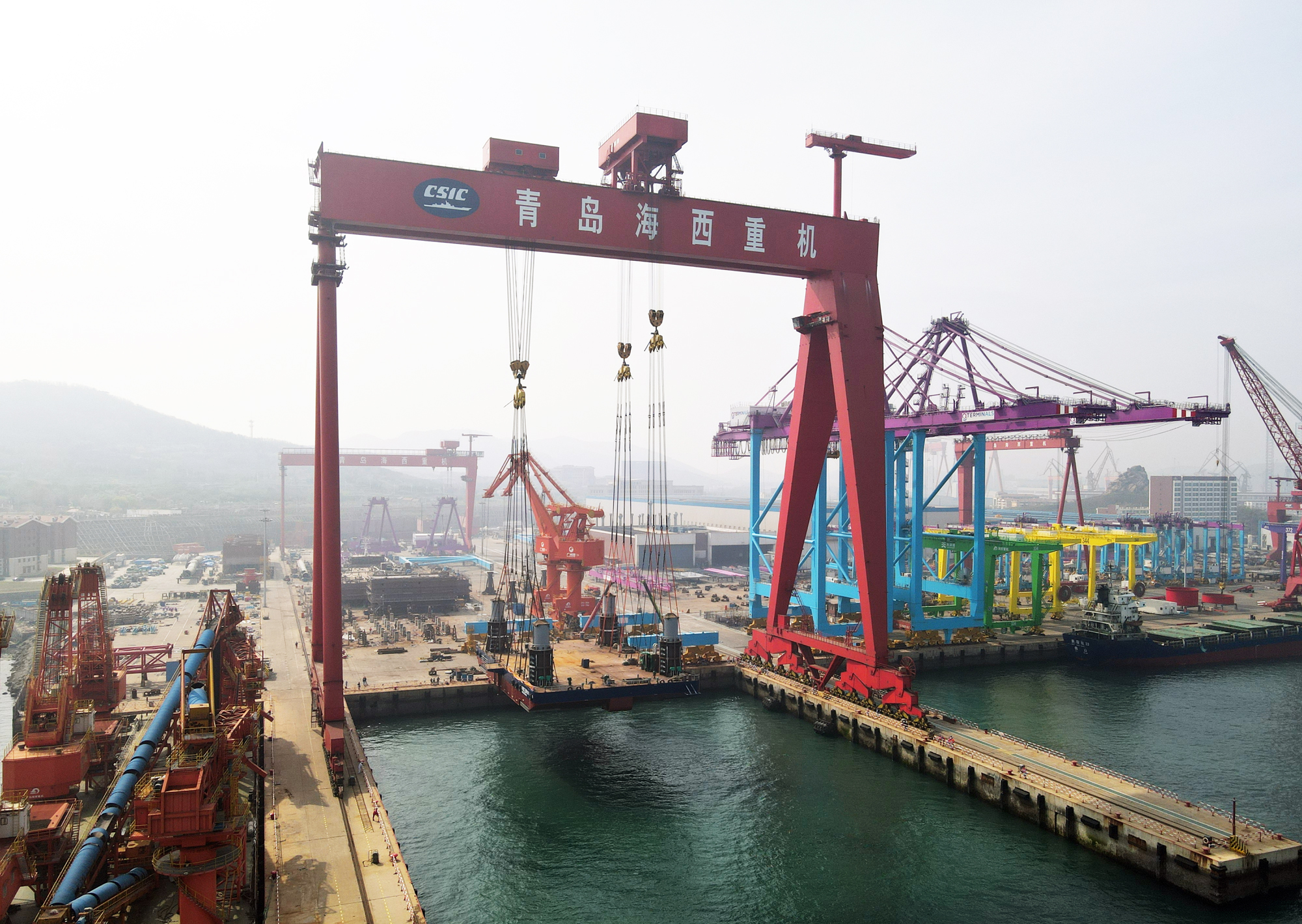 此次平臺(tái)下水,項(xiàng)目組通過反復(fù)論證和方案評(píng)審,充分發(fā)揮公司的場(chǎng)地和設(shè)備優(yōu)勢(shì),最終決定采用1600T龍門吊整體吊裝下水。整體吊裝下水的核心控制點(diǎn)為平衡“減少吊裝重量”和“平臺(tái)施工完整性”,吊裝方案設(shè)計(jì)時(shí)便對(duì)吊裝重量進(jìn)行精確控制,同時(shí)采用軟件模擬優(yōu)化吊裝方案,在充分考慮吊裝重量安全的情況下,兼顧了平臺(tái)的施工完整性。