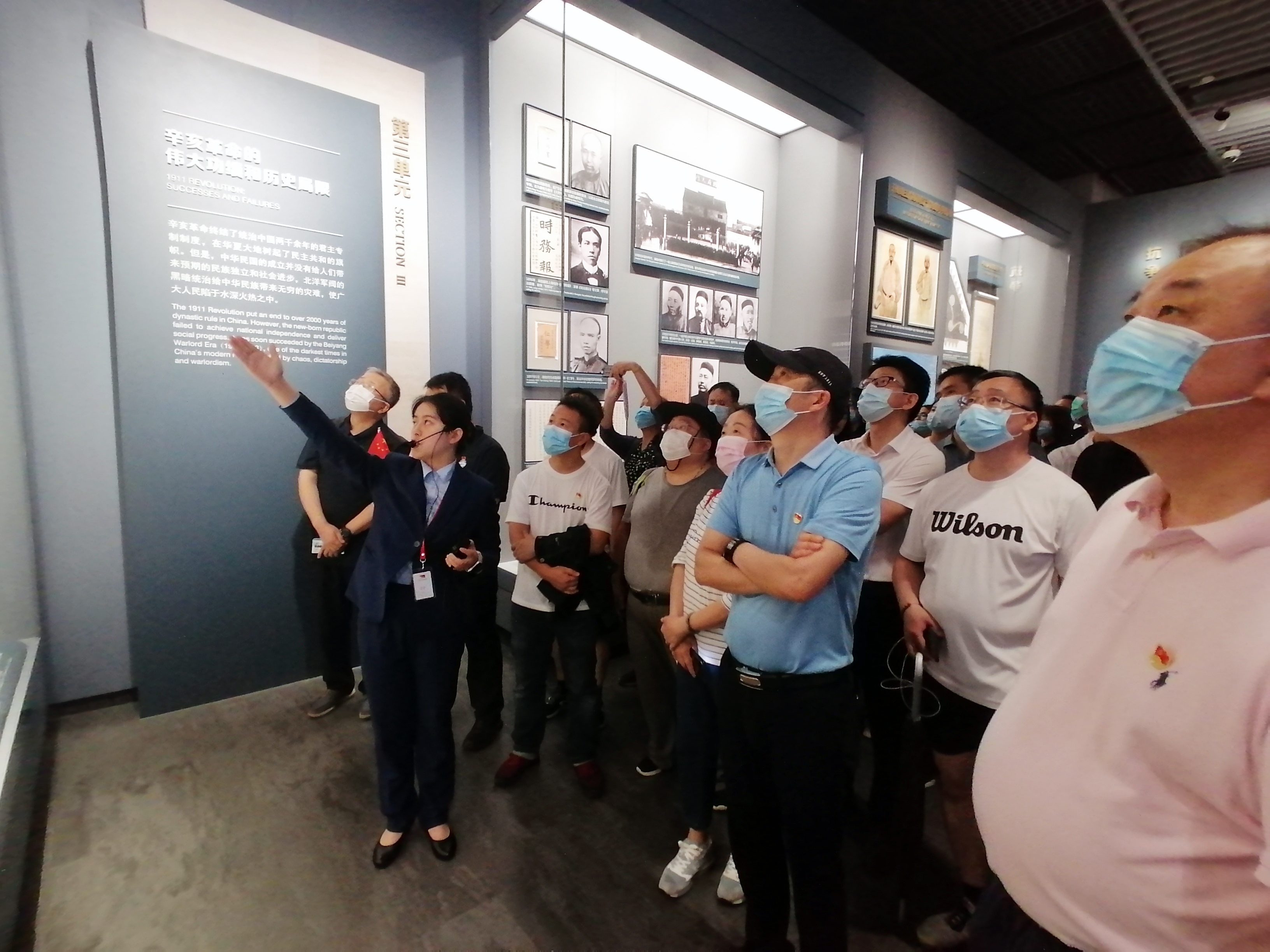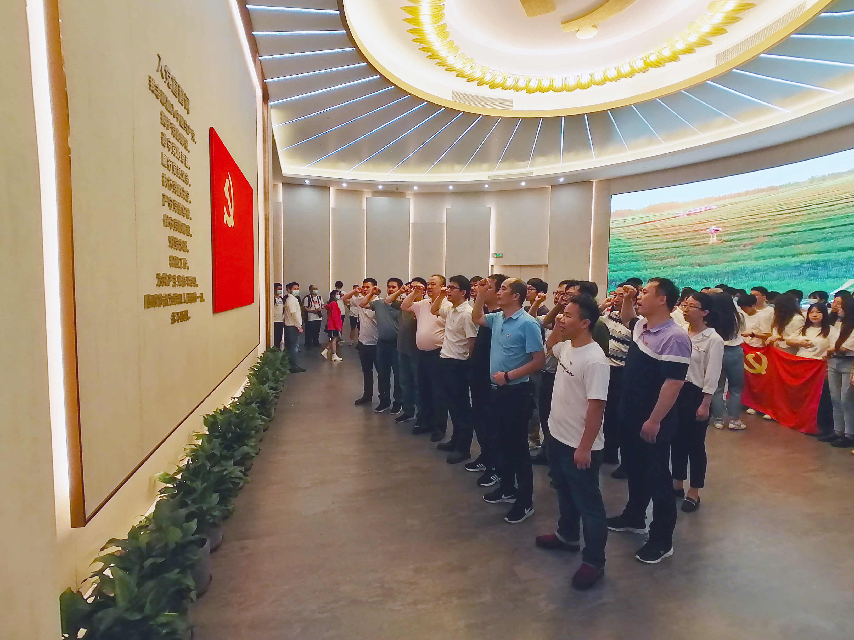 走進紀念館,映入眼簾的是一個巨幅瓷板畫《日出東方——從石庫門到天安門》,畫面中容納了一大會址、紅船、井岡山、北京天安門等革命圣地元素,反映了中國共產(chǎn)黨由小到大、由弱到強的奮斗歷程。進入序廳,迎接參觀者的是主題雕塑《偉大的開端》,13位一大代表站在石庫門前,向我們展示著他們的堅定信念和激昂的革命情懷。跟隨講解員,沿著展區(qū)布景的脈絡(luò)一路參觀了“前仆后繼、救亡圖存”,“民眾覺醒、主義抉擇”,“早期組織、星火初燃”,“開天辟地、日出東方”,“砥礪前行、光輝歷程”五個部分,展廳集中呈現(xiàn)了建黨時期的珍貴文獻、照片、實物,并以數(shù)字化、智能化的方式,立體重現(xiàn)了中國共產(chǎn)黨建黨初期在上海的革命實踐。大家在銘刻歷史印記的文物實物,內(nèi)容詳實的刊物、圖片、圖表前駐足,在視頻影像和場景還原處停留,仔細聆聽講解,用心感悟、感知中國共產(chǎn)黨在上海創(chuàng)建的光榮歷史、奮斗歷程。最后,在宣誓大廳,面對鮮紅的黨旗,朱聲凱帶領(lǐng)大家宣誓,一起重溫入黨誓詞。