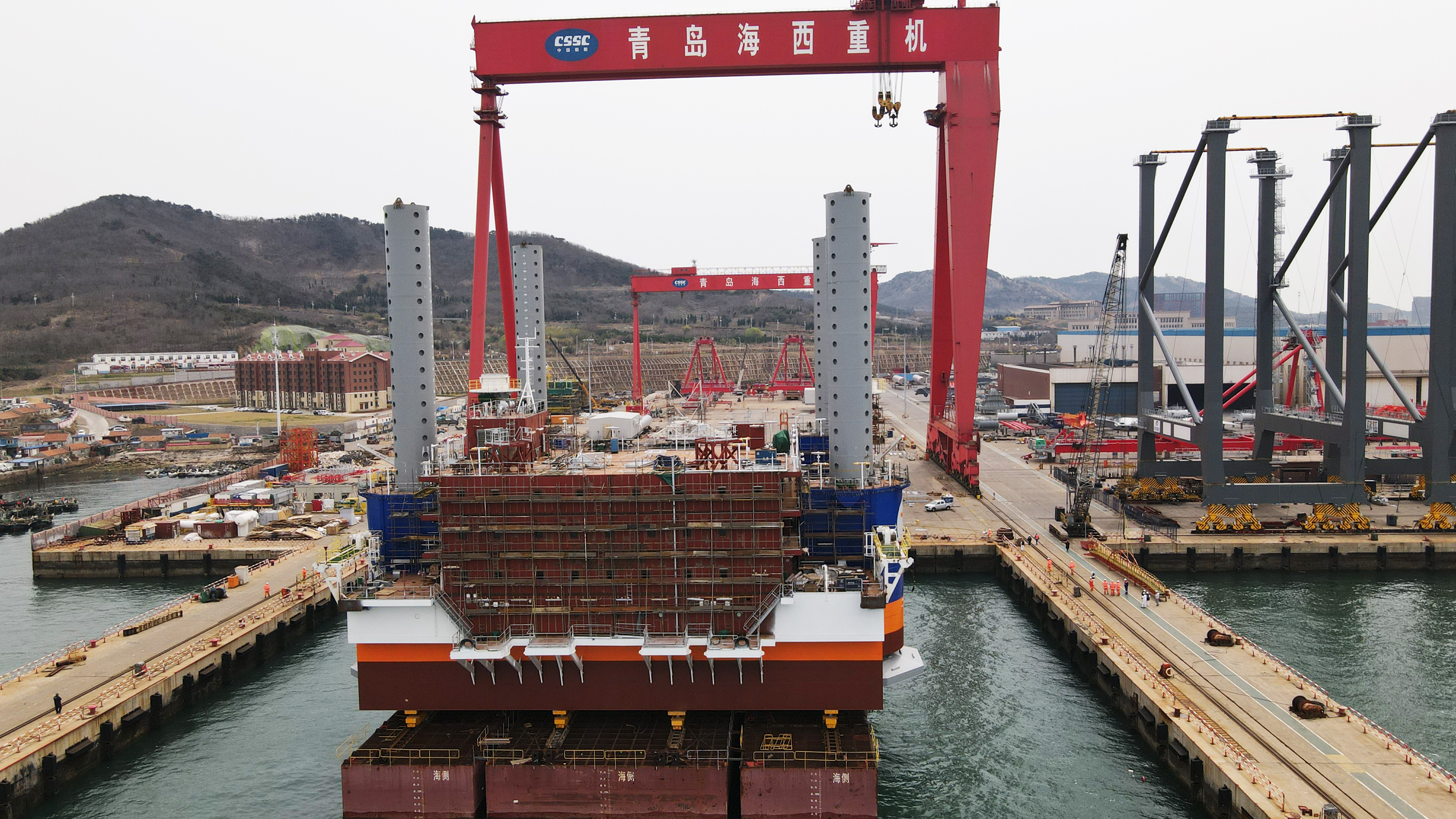 4月13日,隨著云軌小車勻速前進(jìn)至水箱指定位置,馬來(lái)西亞可移動(dòng)自升式生產(chǎn)(天然氣)平臺(tái)(H27)順利完成滑移下水。