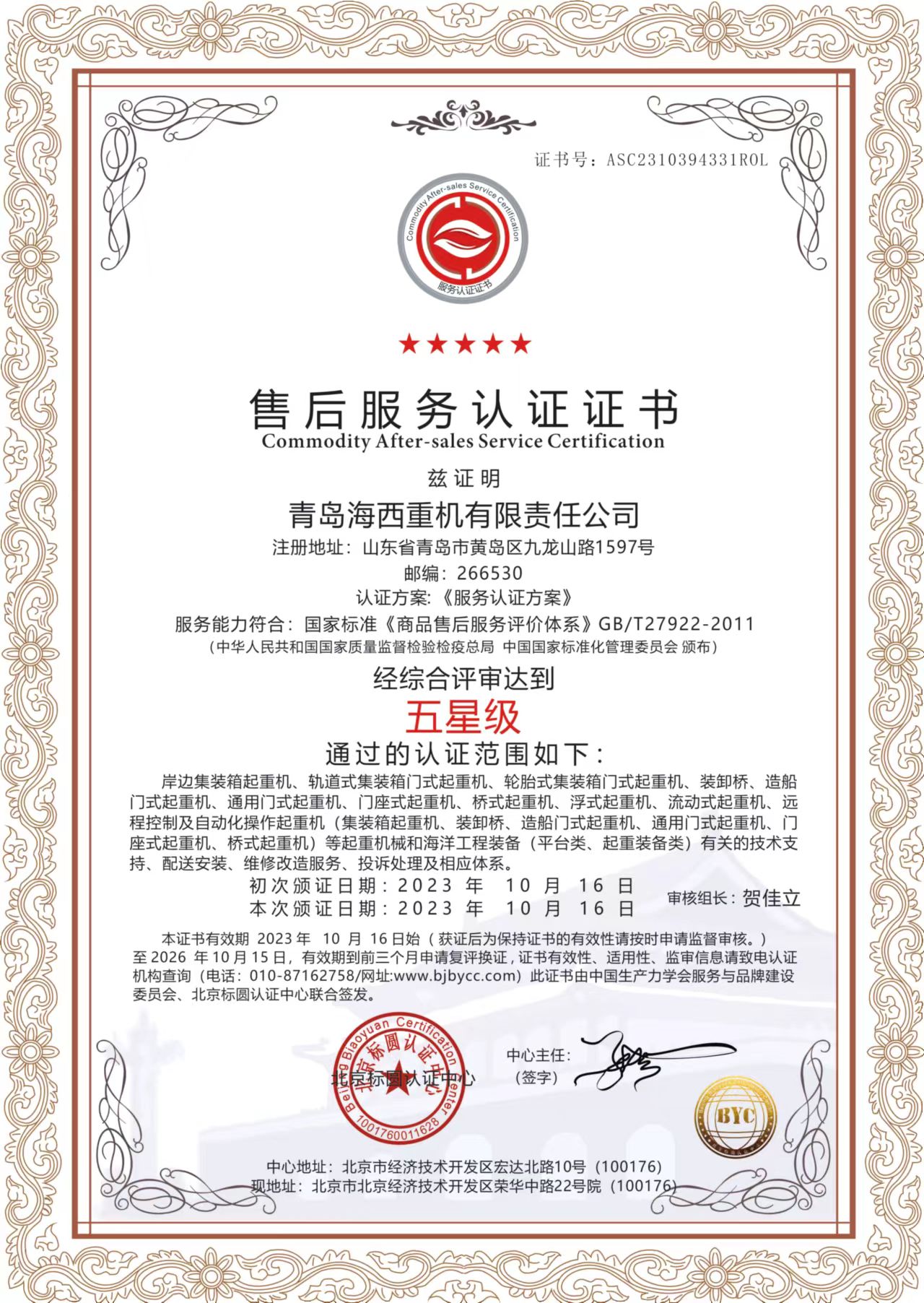 近日,中國(guó)船舶集團(tuán)旗下武漢船機(jī)海西重機(jī)公司售后服務(wù)通過(guò)中國(guó)生產(chǎn)力學(xué)會(huì)服務(wù)與品牌建設(shè)委員會(huì)、北京標(biāo)圓認(rèn)證中心聯(lián)合認(rèn)證,榮獲五星級(jí)認(rèn)證證書(shū)。這一認(rèn)證的獲得,不僅僅是對(duì)海西重機(jī)售后服務(wù)成果的認(rèn)可,更是對(duì)海西重機(jī)致力于提供優(yōu)質(zhì)服務(wù)能力的肯定。