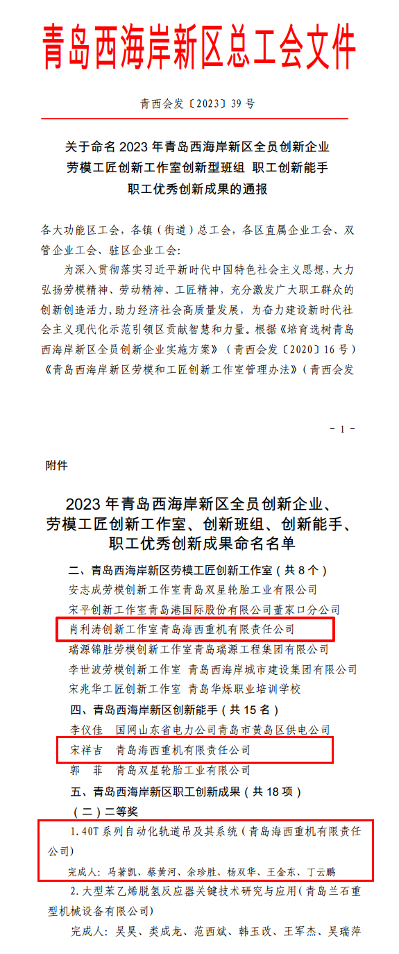 此次評選工作由青島西海岸新區(qū)總工會(huì)組織開展,經(jīng)過海西重機(jī)基層工會(huì)推薦,資料申報(bào)、西海岸新區(qū)總工會(huì)資格審查、專家組評審,區(qū)總工會(huì)現(xiàn)場考察、會(huì)議研究及社會(huì)公示等環(huán)節(jié),最終“肖利濤創(chuàng)新工作室”榮獲西海岸新區(qū)“勞模工匠創(chuàng)新工作室”榮譽(yù)稱號,位居同類第三;“40T系列自動(dòng)化軌道吊及其系統(tǒng)(完成人:馬著凱、蔡黃河、余珍勝、楊雙華、王金東、丁云鵬)”榮獲西海岸新區(qū)“職工創(chuàng)新成果”二等獎(jiǎng);宋祥吉同志脫穎而出,榮獲西海岸新區(qū)“職工創(chuàng)新能手”榮譽(yù)稱號。