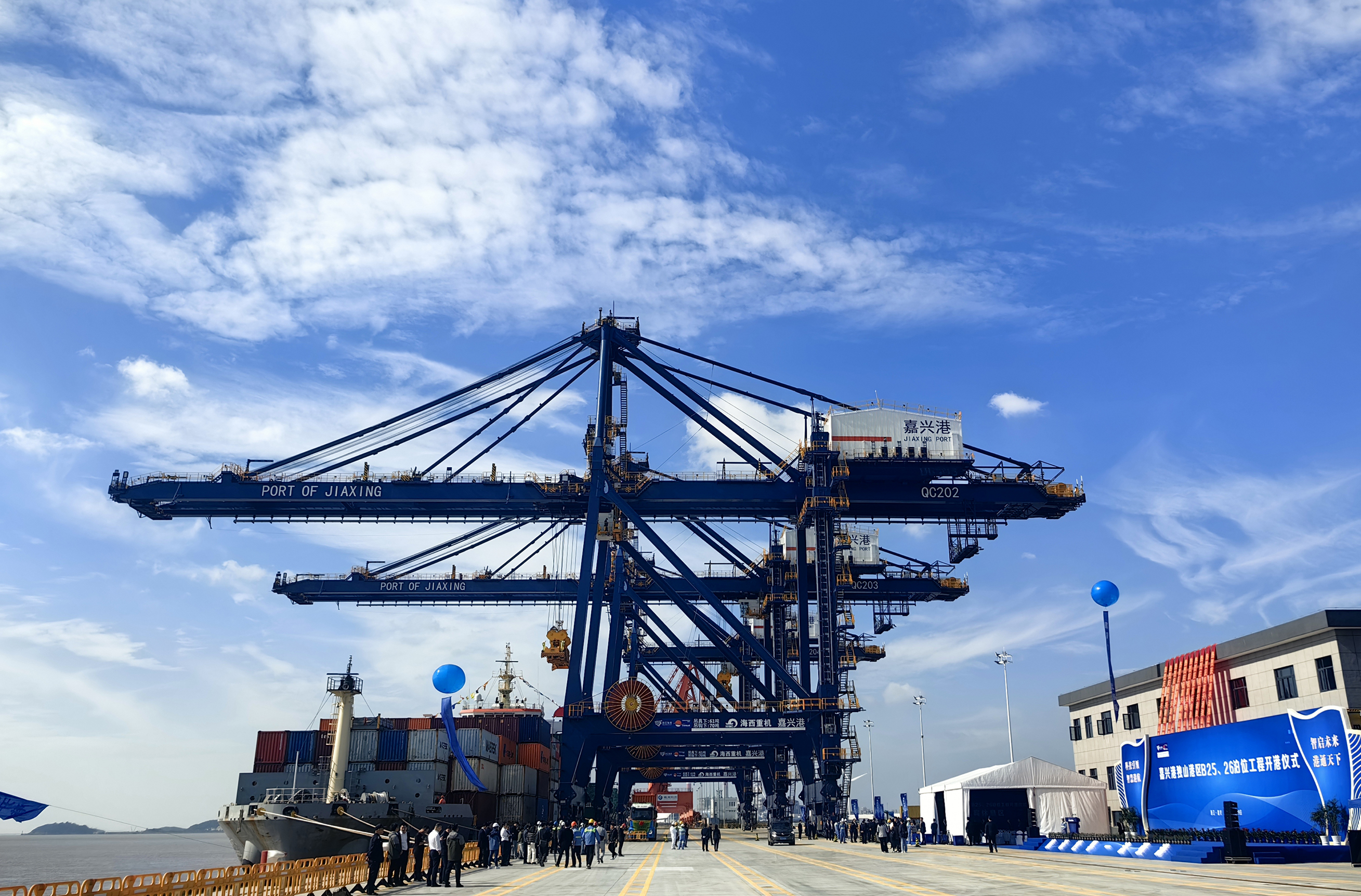 10月29日上午,浙江省海港集團(tuán)、寧波舟山港集團(tuán)嘉興港獨(dú)山港區(qū)B25、26泊位和Ⅱ號(hào)內(nèi)河港池開港儀式舉行。這標(biāo)志著嘉興港又一個(gè)萬噸級(jí)碼頭和海河聯(lián)運(yùn)作業(yè)區(qū)正式投入使用。海西重機(jī)作為項(xiàng)目參建單位參加儀式。