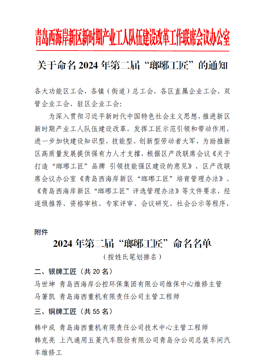 為深入貫徹習(xí)近平新時(shí)代中國(guó)特色社會(huì)主義思想,推進(jìn)新區(qū)新時(shí)期產(chǎn)業(yè)工人隊(duì)伍建設(shè)改革,發(fā)揮工匠示范引領(lǐng)和帶動(dòng)作用,進(jìn)一步加快建設(shè)知識(shí)型、技能型、創(chuàng)新型勞動(dòng)者大軍,為助推新區(qū)高質(zhì)量發(fā)展提供強(qiáng)有力人才支撐,根據(jù)區(qū)產(chǎn)改聯(lián)席會(huì)議《關(guān)于打造“瑯琊工匠”品牌引領(lǐng)技能強(qiáng)區(qū)建設(shè)的意見》、區(qū)產(chǎn)改聯(lián)席會(huì)議辦公室《青島西海岸新區(qū)“瑯琊工匠”培育管理辦法》、《青島西海岸新區(qū)“瑯琊工匠”評(píng)選管理辦法》等文件要求,經(jīng)逐級(jí)推薦、資格審核、專家評(píng)審、會(huì)議研究、社會(huì)公示等程序,最終100 名同志脫穎而出,入選新區(qū)第二屆“瑯琊工匠”。