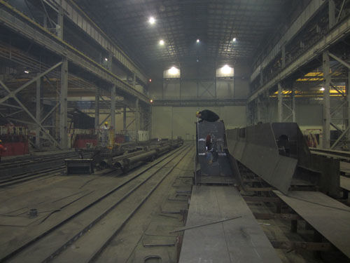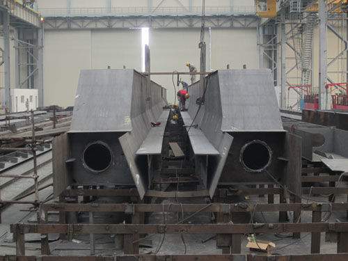G126為一臺鹽城大豐港的集裝箱裝卸起重機(jī),該項(xiàng)目13年1月初開工,5月底交付使用,中間要跨越春節(jié),工期異常緊張。為了確保該項(xiàng)目按期交貨,項(xiàng)目部、鋼構(gòu)部、工藝部、品質(zhì)部在項(xiàng)目開工前就進(jìn)行了多次溝通,明確了生產(chǎn)任務(wù)。工藝部總結(jié)以往經(jīng)驗(yàn),并積極采納承制單位建議,優(yōu)化了制作工藝。品質(zhì)部在加強(qiáng)關(guān)鍵點(diǎn)控制的基礎(chǔ)上,明確、簡化了檢驗(yàn)流程。鋼構(gòu)部按時(shí)間分割生產(chǎn)節(jié)點(diǎn),嚴(yán)控人員及施工進(jìn)度,制定了一系列的保障措施。目前G126項(xiàng)目開工僅半月時(shí)間,所有箱體結(jié)構(gòu)均已裝配成形,部分構(gòu)件如門框上橫梁已處于完工報(bào)檢階段,施工難度相對較大的前、后大梁已開始承軌梁裝配作業(yè)。施工進(jìn)度基本處于計(jì)劃控制范圍。