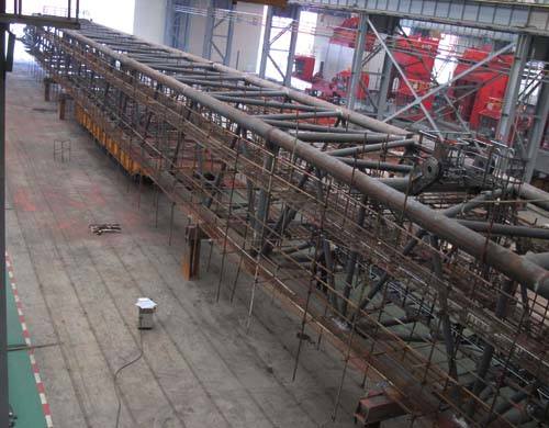 500T全回轉(zhuǎn)固定吊臂架長(zhǎng)110米,寬6.5米,高5米,重達(dá)200余噸。自接到生產(chǎn)任務(wù)以來(lái),針對(duì)該項(xiàng)目生產(chǎn)任務(wù)緊、制作周期短、難度大等特性,鋼構(gòu)部統(tǒng)籌部署,多管齊下,確保項(xiàng)目進(jìn)展。首先以節(jié)點(diǎn)實(shí)現(xiàn)率為重點(diǎn),細(xì)化施工隊(duì)、焊工隊(duì)節(jié)點(diǎn)考核,嚴(yán)格執(zhí)行;其次考慮技術(shù)熟練程度和連續(xù)性,所有施工及管理人員均采用3600T浮吊臂架原班人馬,各工種24小時(shí)不間斷作業(yè),全力推進(jìn)項(xiàng)目進(jìn)展;第三各負(fù)責(zé)調(diào)度、檢驗(yàn)人員、工藝人員等各司其職、齊心協(xié)力,監(jiān)管措施到位,工序銜接順暢,確保臂架各分支計(jì)劃穩(wěn)步推進(jìn)。在各項(xiàng)有效措施的保障下,在工藝部和品質(zhì)部的全力配合下,該臂架制作歷時(shí)不到40天,制作周期較同類型吊臂架縮短了一倍以上,且一次探傷合格率達(dá)98.5%,結(jié)構(gòu)質(zhì)量和外觀成型得到了業(yè)主的一致認(rèn)可和表?yè)P(yáng),創(chuàng)造了鋼構(gòu)部制作行架結(jié)構(gòu)件的奇跡!