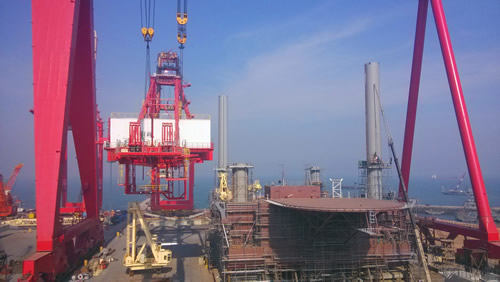 2014年3月2日,在海西重機(jī)橋吊部裝工場上方,1600t大型龍門起重機(jī)下方,一臺長度為140m、寬度為30m的岸橋大梁組件從一臺90m自升式海洋平臺聳立的樁腿旁邊穿過,順利與突堤碼頭上的門框合攏,證實了海西重機(jī)在港機(jī)和海工兩個領(lǐng)域同步發(fā)展的能力和實力。