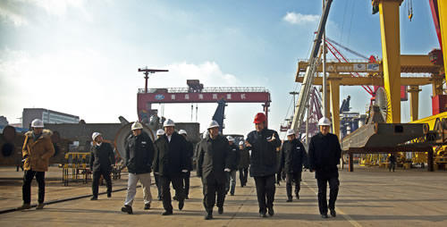 許克振一行實(shí)地考察了海西重機(jī)生產(chǎn)現(xiàn)場(chǎng)及組裝發(fā)運(yùn)現(xiàn)場(chǎng),參觀了包括韓國(guó)批量岸橋、自動(dòng)化軌道吊等在內(nèi)的港口機(jī)械設(shè)備及在制的批量自升式海工平臺(tái)項(xiàng)目,看望慰問(wèn)了生產(chǎn)一線干部職工,并在隨后召開(kāi)的中船重工青島海西灣基地相關(guān)企業(yè)負(fù)責(zé)人座談會(huì)上,聽(tīng)取了海西重機(jī)董事長(zhǎng)孫總關(guān)于企業(yè)產(chǎn)品結(jié)構(gòu)、技術(shù)創(chuàng)新、生產(chǎn)經(jīng)營(yíng)及中長(zhǎng)期發(fā)展規(guī)劃等方面的情況匯報(bào)。